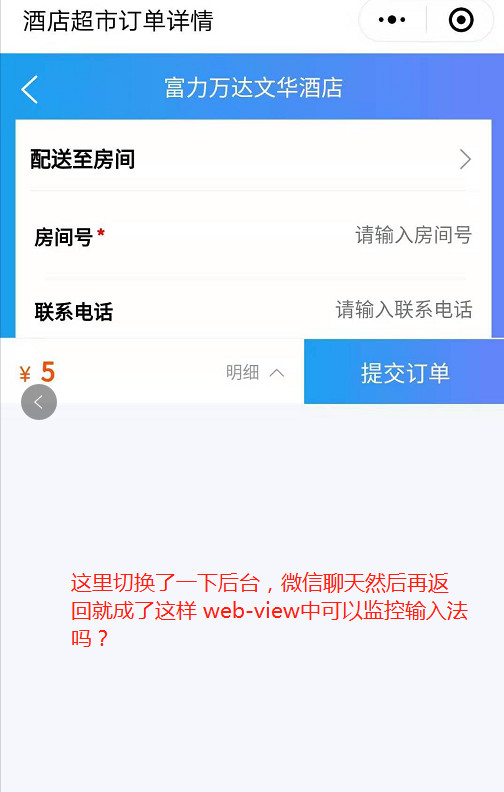 步骤就是我开始截图的,您看一下,就是有个输入框 我点击后调用输入法 ,然后有微信消息来了 我点消息去回复再返回到小程序中的时候,样式就变了