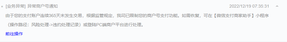 支付时提示如下信息,此商家的收款功能已被限制,暂无法支付。商家可以登录微信商户平台/微信支付商家助手小程序查看原因和解决方案