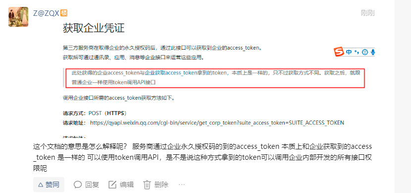 这个文档的意思是怎么解释呢? 服务商通过企业永久授权码的到的access_token 本质上和企业获取到的access_token 是一样的 可以使用token调用API,是不是说这种方式拿到的token可以调用企业内部开发的所有接口权限呢