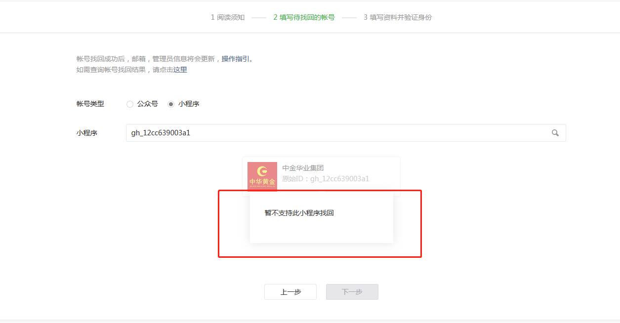 小程序长时间没有登录被冻结了,没有违规,现在登录进去进行账号找回操作,输入原始ID查到小程序之后显示该小程序不支持找回,这是什么原因呢??有人能给解答一下吗??