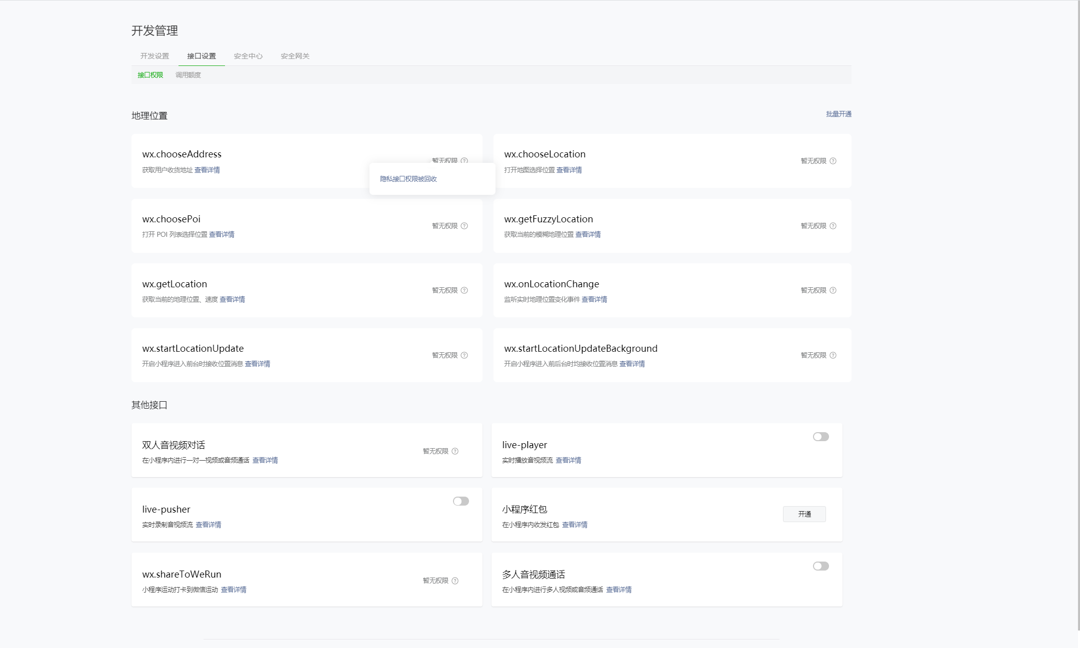 老师看下这个小程序的地理位置权限提示隐私接口权限被收回是什么原因,已备案认证,并且根据官方文档比对均没有发现问题。请帮忙看不下,着急。