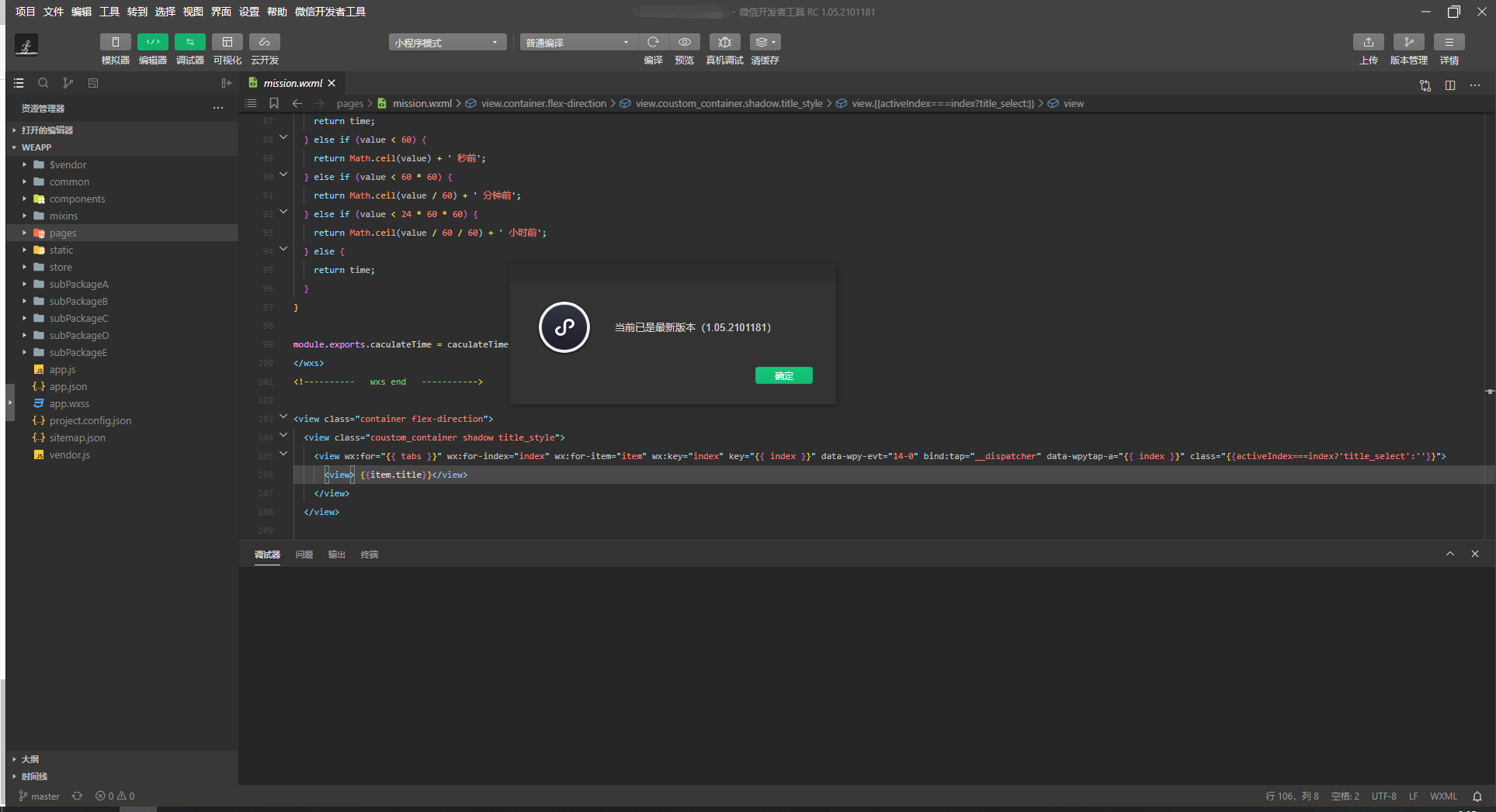 关闭微信开发者工具,然后再打开就好了,我的版本是:1.052102010