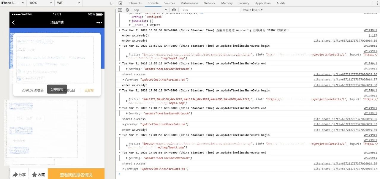 之后啥反应都没有。通过开发者工具,也看起来很正常,但无法分享。 checkJsApi:ok, wx.updateTimelineShareData begin wx.updateTimelineShareData end 怎么解决?
