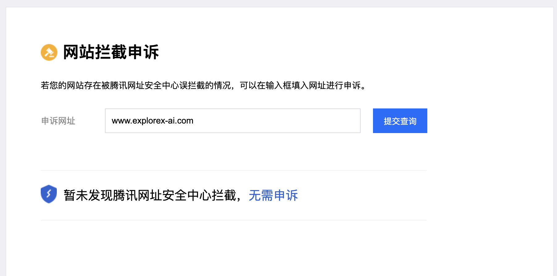 您好,域名www.explorex-ai.com 已备案通过,浏览器访问正常,我是网站开发者,网页内容如下,访问时间为2025.11.4日 11:08 。微信访问网站出现“已停止访问该网页”,经检查网页里没有色情等不良内容,腾讯安全中心检测无异常。请核实后帮忙解除拦截,谢谢!