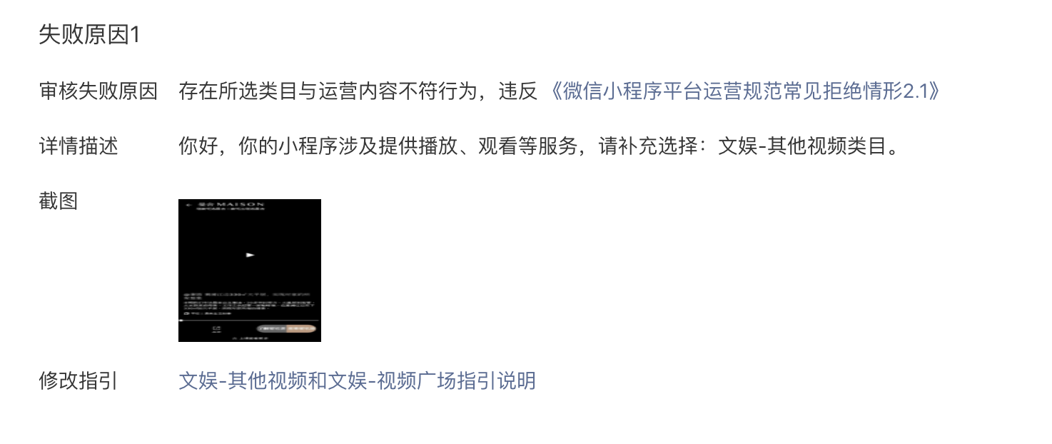 ①补充【文娱-其他视频】类目。小程序类目适用范围及其资质详情:https://developers.weixin.qq.com/miniprogram/product/material/