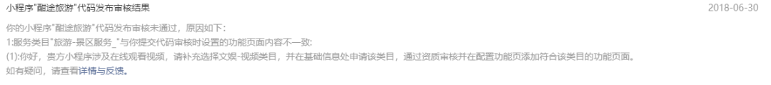 您好!我司(酣途(海南)网络科技有限公司) 第二版“酣途旅游”小程序 在提交审核时又遇到上次所说的情况,“贵方小程序涉及在线观看视频,请补充选择文娱-视频类目,并在基础信息处申请该类目,通过资质审核并在配置功能页添加符合该类目的功能页面”理由驳回我司的上线申请,把我们归属于文娱的视频(如下图)。