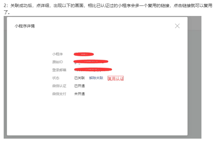 2:关联成功后,点详细,出现以下的画面,相比已认证过的小程序会多一个复用的链接,点击链接就可以复用了。