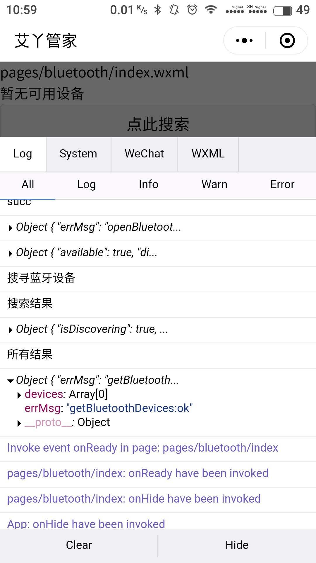 你好,startBluetoothDevicesDiscovery 是开启设备的蓝牙搜索,开始后马上 getBluetoothDevices 几乎是拿不到搜索的设备的,建议给设备一段搜索时间再获取搜索到的蓝牙设备列表。