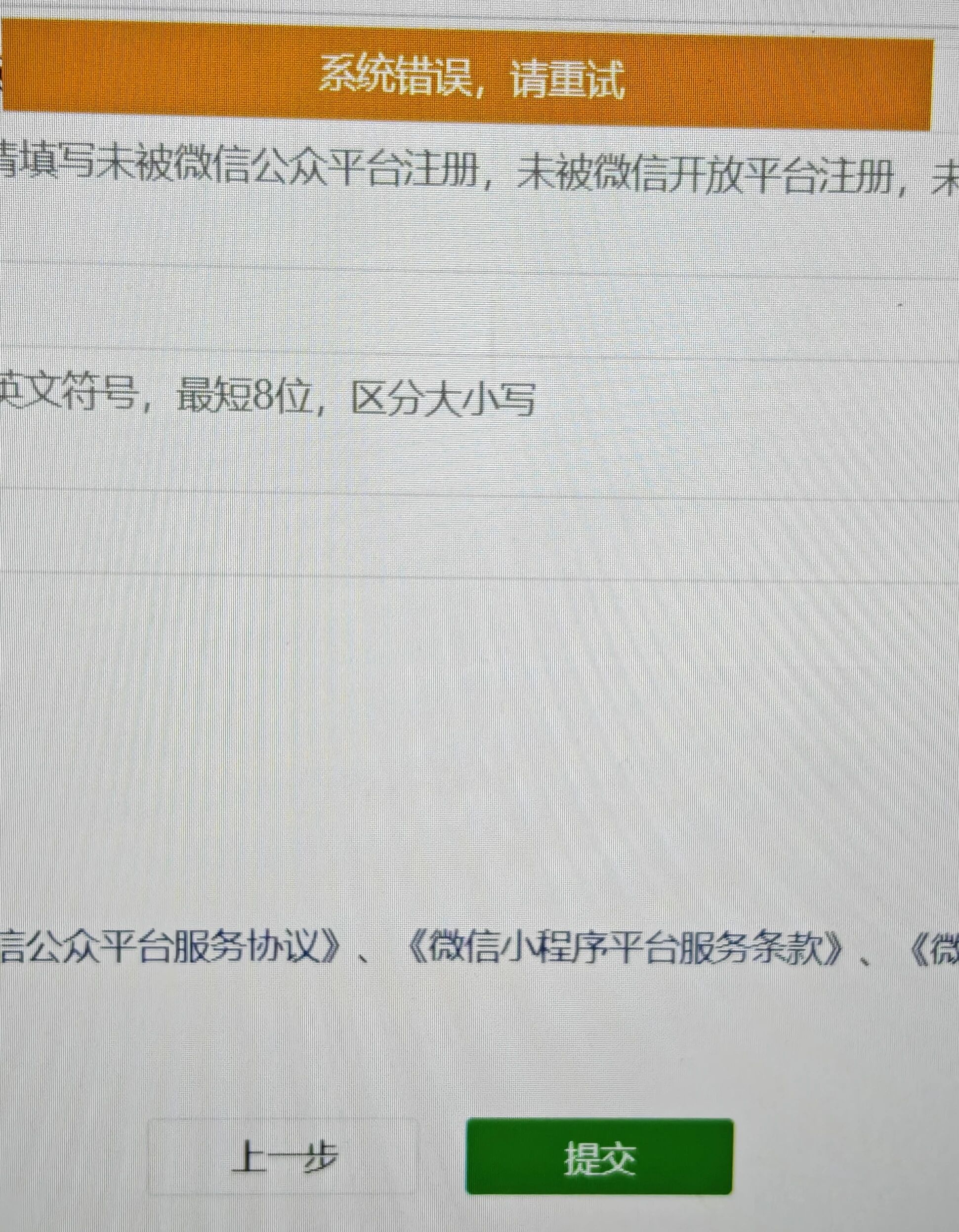 通过微信公众号开通快速创建小程序,到填写小程序账号信息这一步点提交一直显示错误,不是政府类的是企业类的