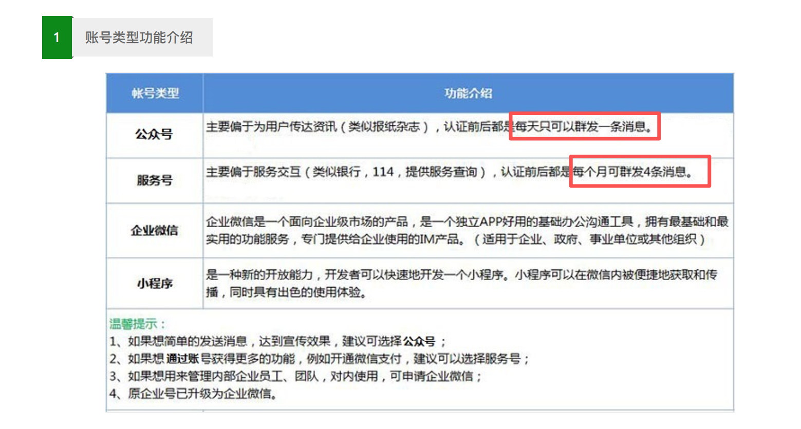 截图的表格是哪里来的呢?公众号就是订阅号,每天可发一条推文,服务号是每月4条