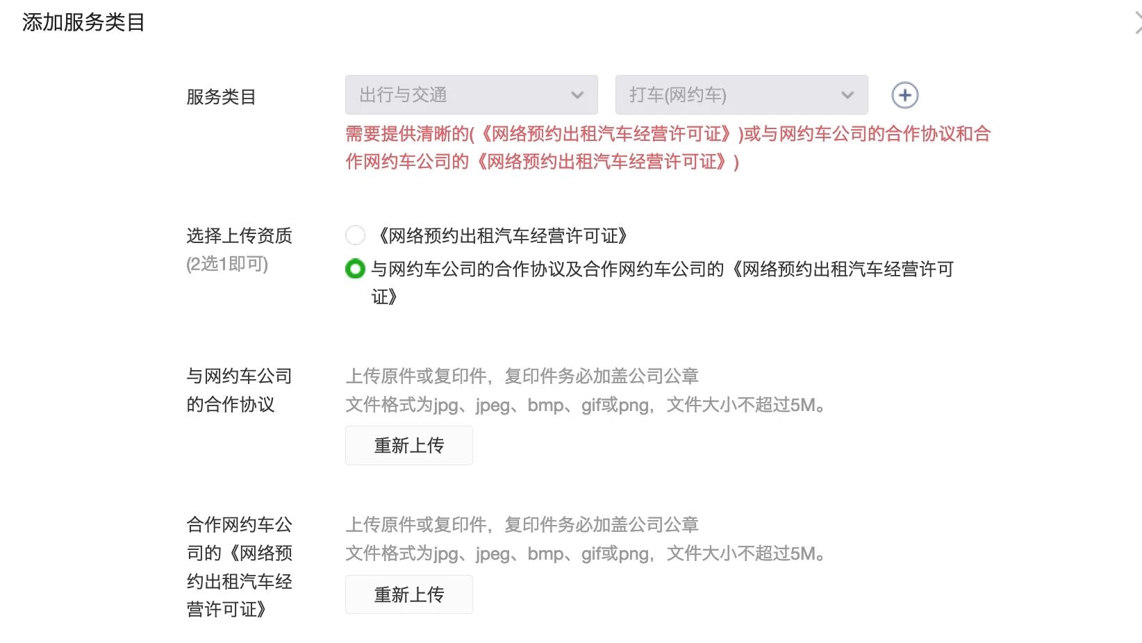 本小程序涉及“网约车”服务类目,提交类目审核时,“需要提供清晰的(《网络预约出租汽车经营许可证》)或与网约车公司的合作协议和合作网约车公司的《网络预约出租汽车经营许可证》)”。