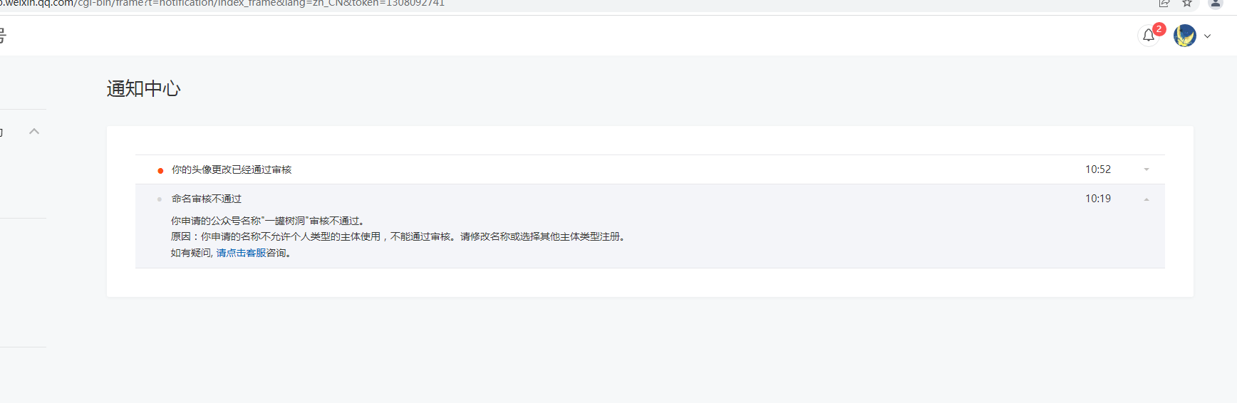 你好,我想问下用个人身份注册的公众号取名叫 一罐树洞 有什么问题,为什么驳回 想这个名字想了好久