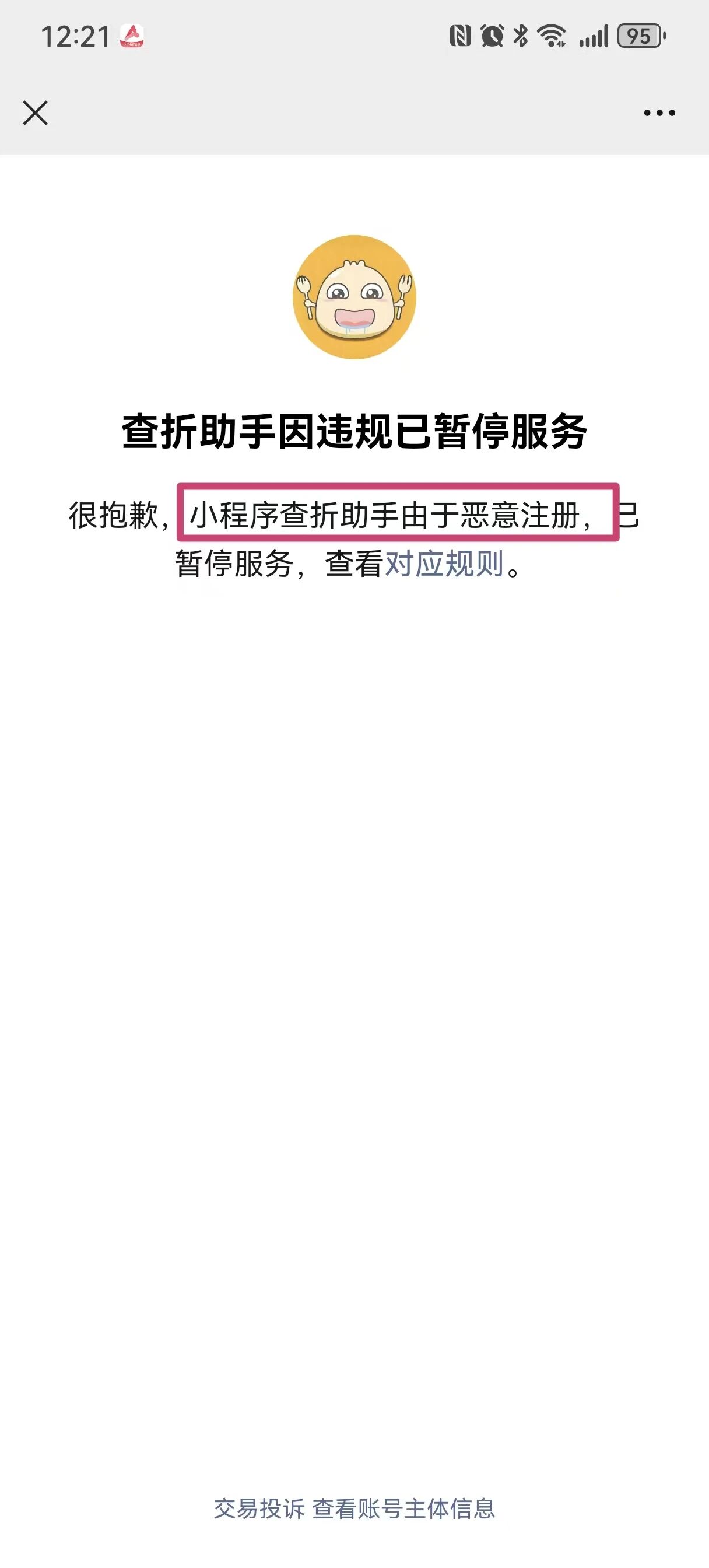 我是【小程序:查折助手,小程序ID:wx3968399db41d90ff】的运营者,我方小程序因“恶意注册”被永久封号,此判定与实际情况不符,请解除封禁。