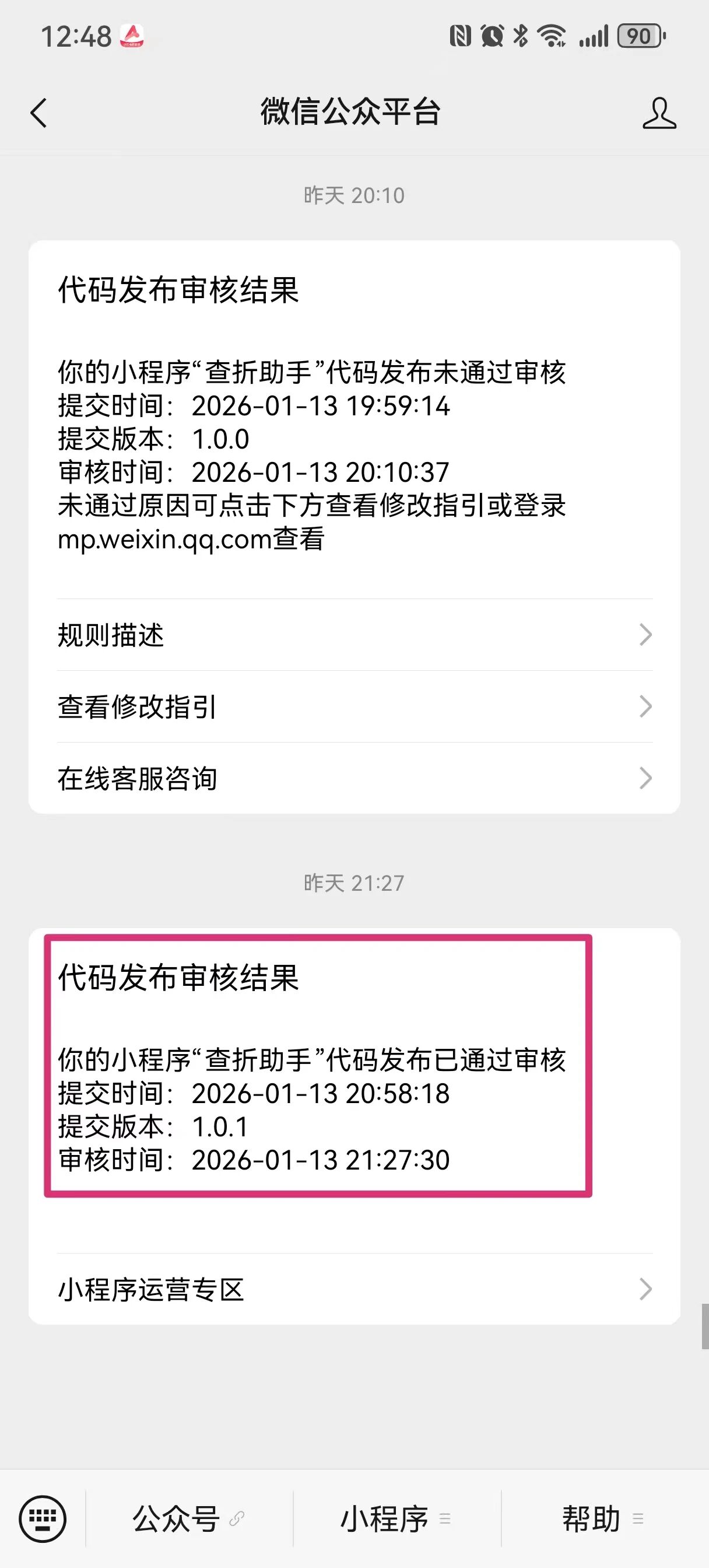 2026-1-13 21:30 发布的小程序代码通过审核,小程序上线。