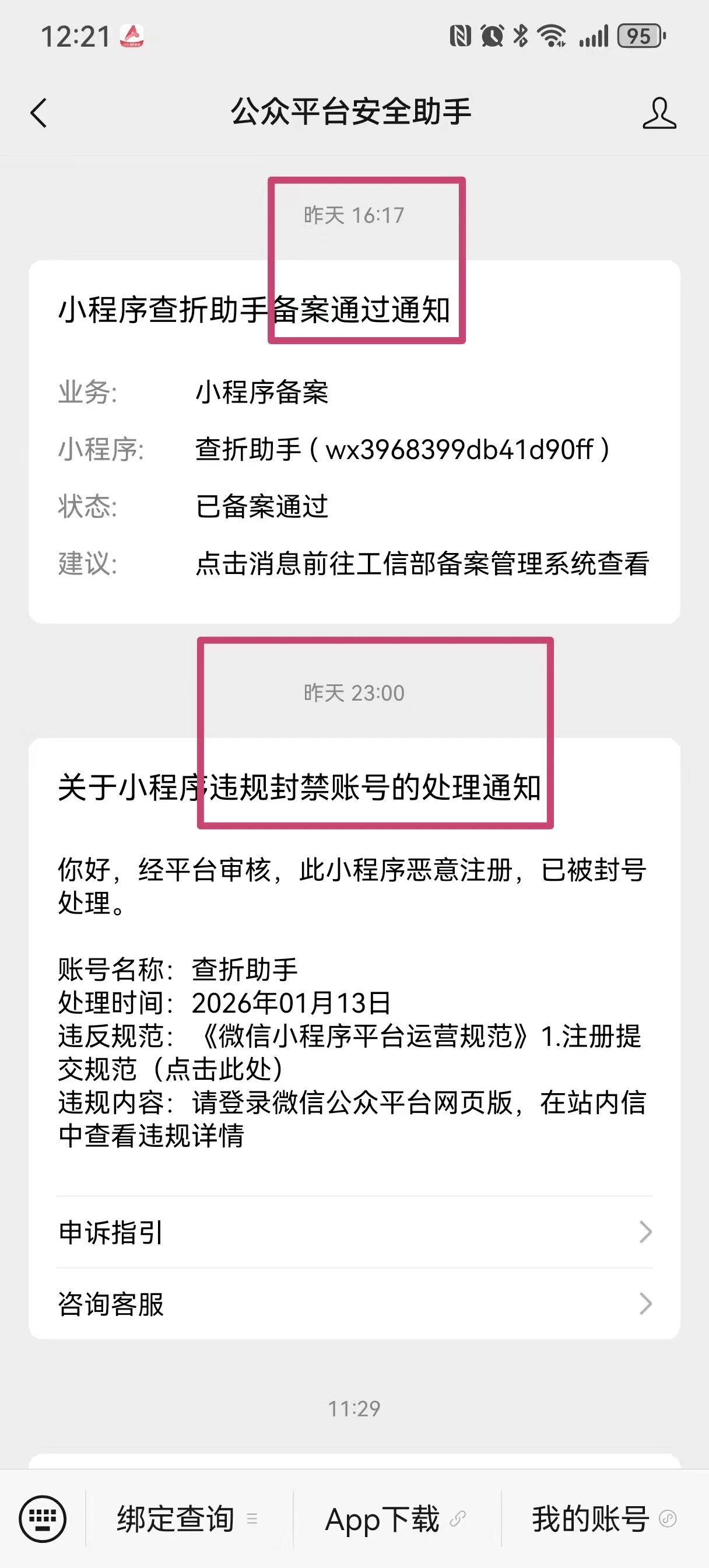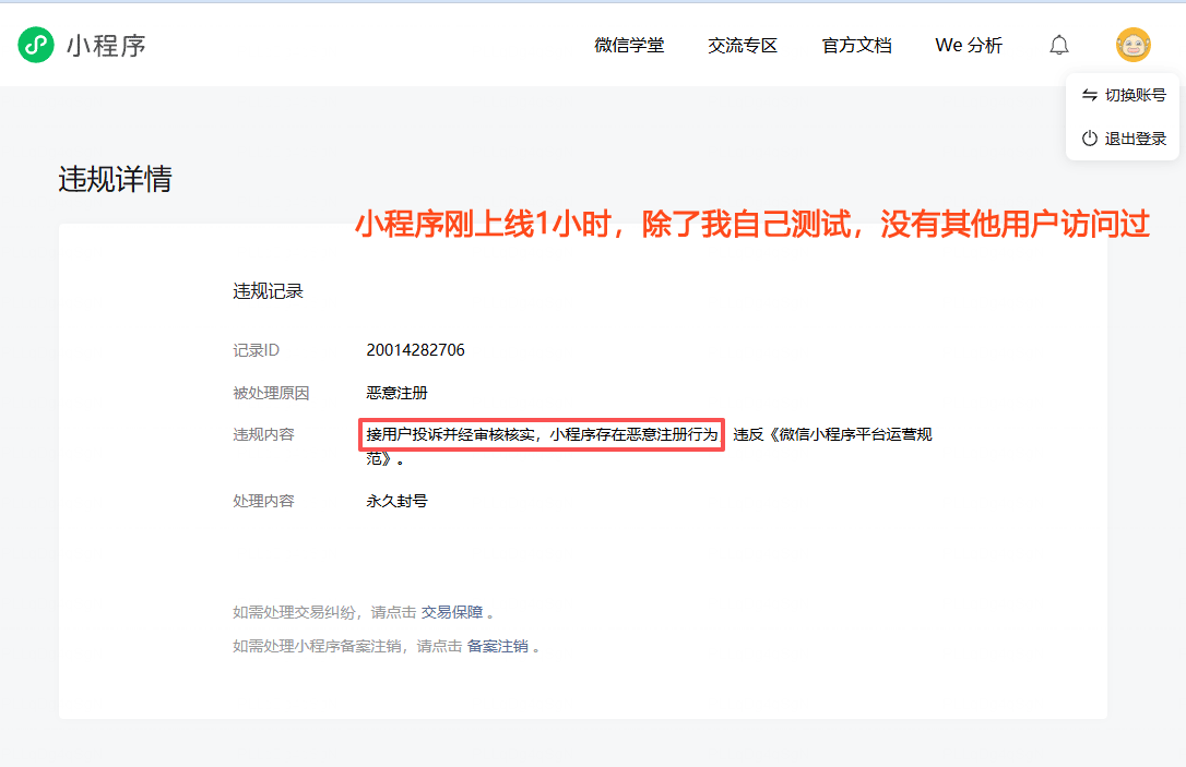 2026-1-13 23:00 收到永久封号通知,提示的违规原因是“接用户投诉并经审核核实,小程序存在恶意注册行为”。小程序刚上线1小时,除了我自己测试,还没有其他用户访问过,不会存在“用户投诉”的情况。