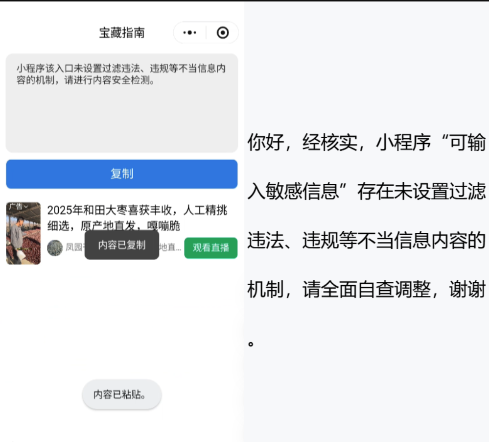 你好,经核实,小程序存在内容安全风险,请加强提升小程序的信息安全防护能力,包括但不限于接入官方内容安全接口(文本/图片等)、增加人工审核复核机制等方式。