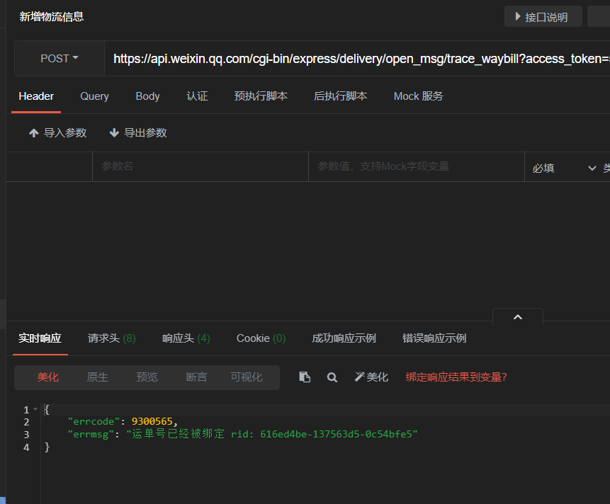 1.由于测试时新增了一部分物流单号导致新增时物流单号重复报错【运单号已经被绑定】,但又没有保存新增时的查询ID【waybill_token】。所以想查询出所有的物流助手单号或者根据物流单号删除此信息。 2.物流助手AIP接口地址:https://developers.weixin.qq.com/miniprogram/dev/platform-capabilities/industry/express/express_search.html