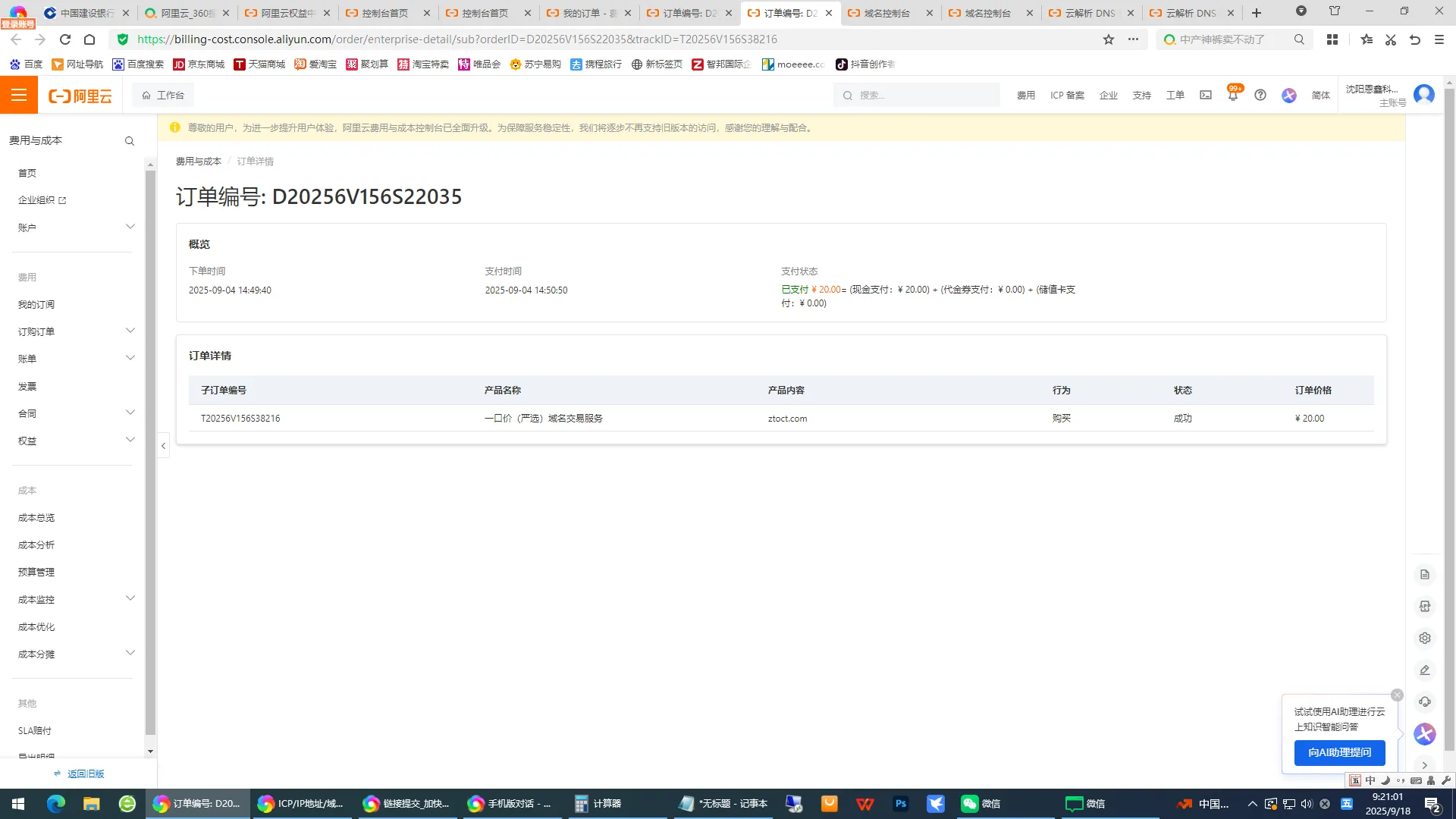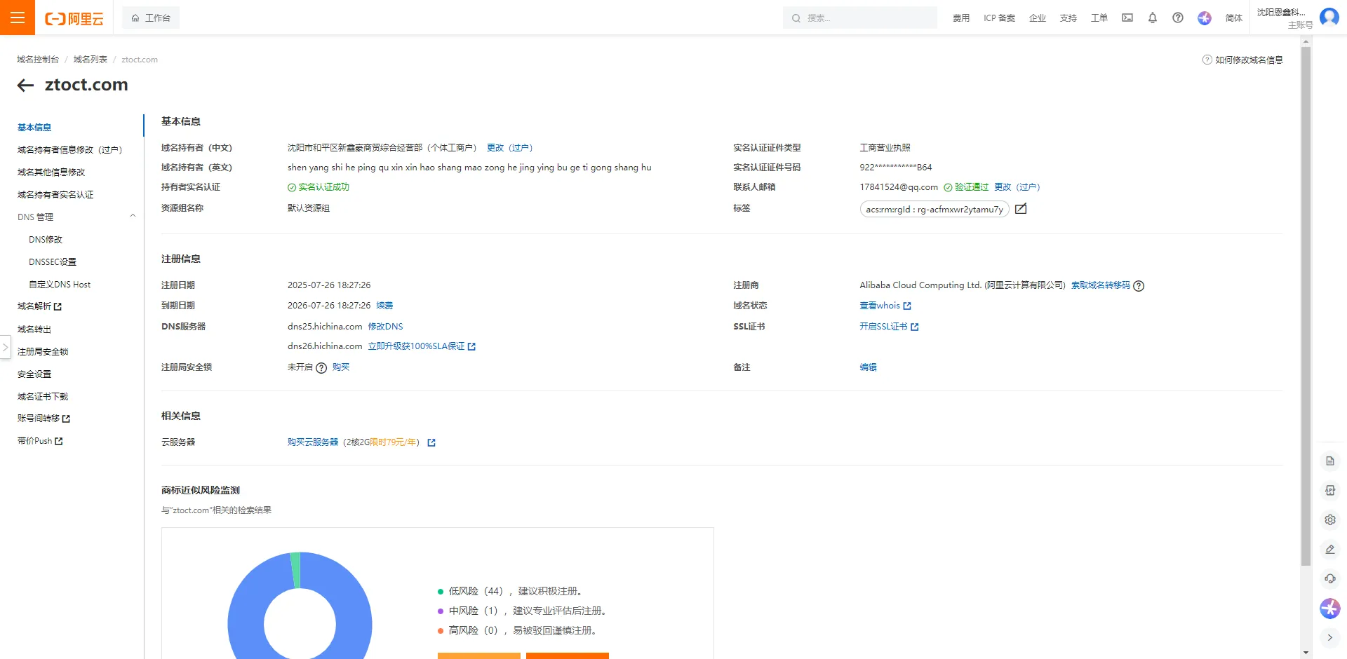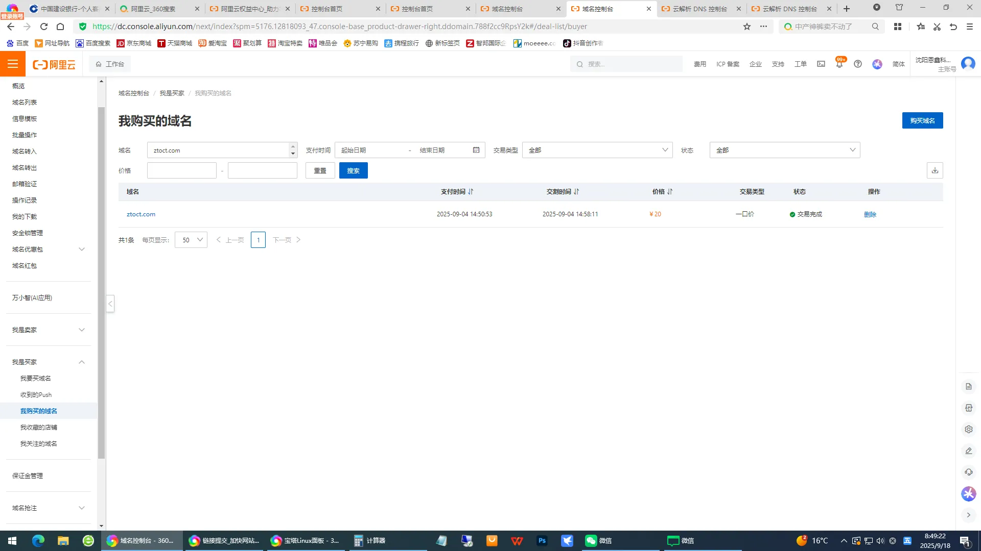 我于 2025 年 9 月 4 日 14 时 50 分 53 秒,在阿里云平台购买了一个二手域名,支付完成后,于当日 14 时 58 分 11 秒完成交割。购买此域名时,我仅关注了域名的位数,并因价格较为便宜而决定购买,完全不知晓该域名已被封禁,对于该域名此前的使用行为更是毫无了解。