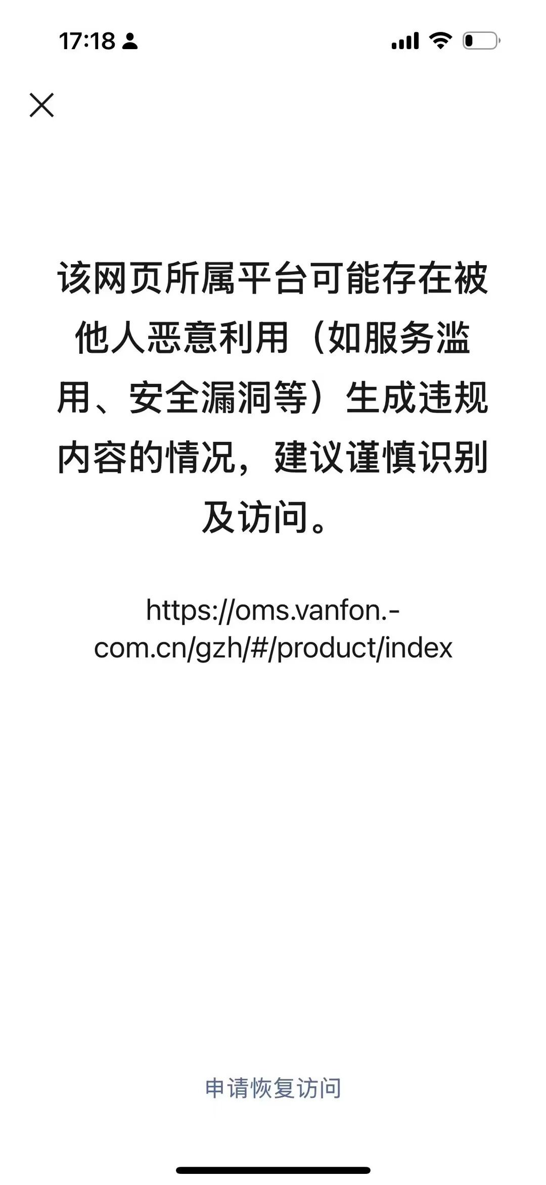 你好,经审核,域名【vanfon.com.cn】下的链接【http://www1.vanfon.com.cn/?85313,8581,mf】等链接的内容存在违反《微信外部链接内容管理规范》的第2.10条“低俗色情类内容”,请排查并把域名下相关违规内容修改并修复安全漏洞后进行申诉;申诉方式可点击停止访问页底部入口进行操作,我们会在三个工作日处理,请耐心等待。 详细规则请参考《微信外部链接内容管理规范》http://weixin.qq.com/cgi-bin/readtemplate?t=weixin_external_links_content_management_specification"