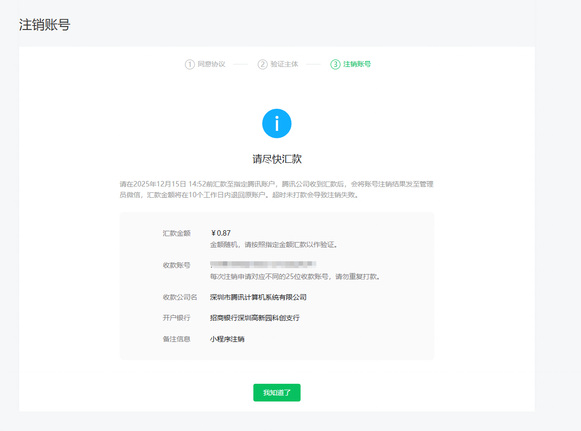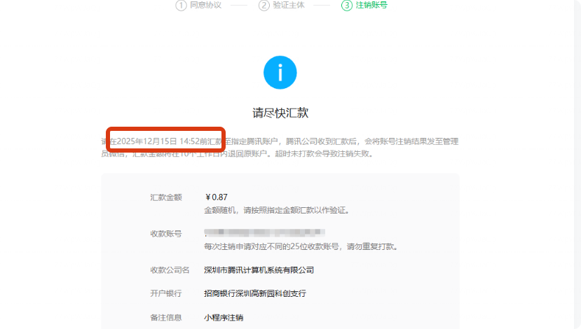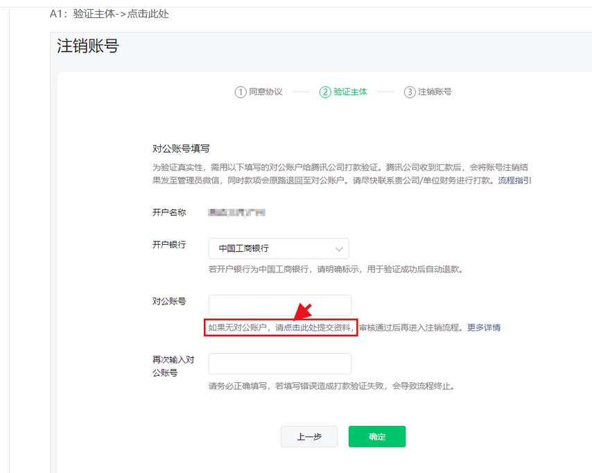 等待超过10天未对公打款验证主体,注销失败后,再次重新发起注销,并选择无对公账号注销。