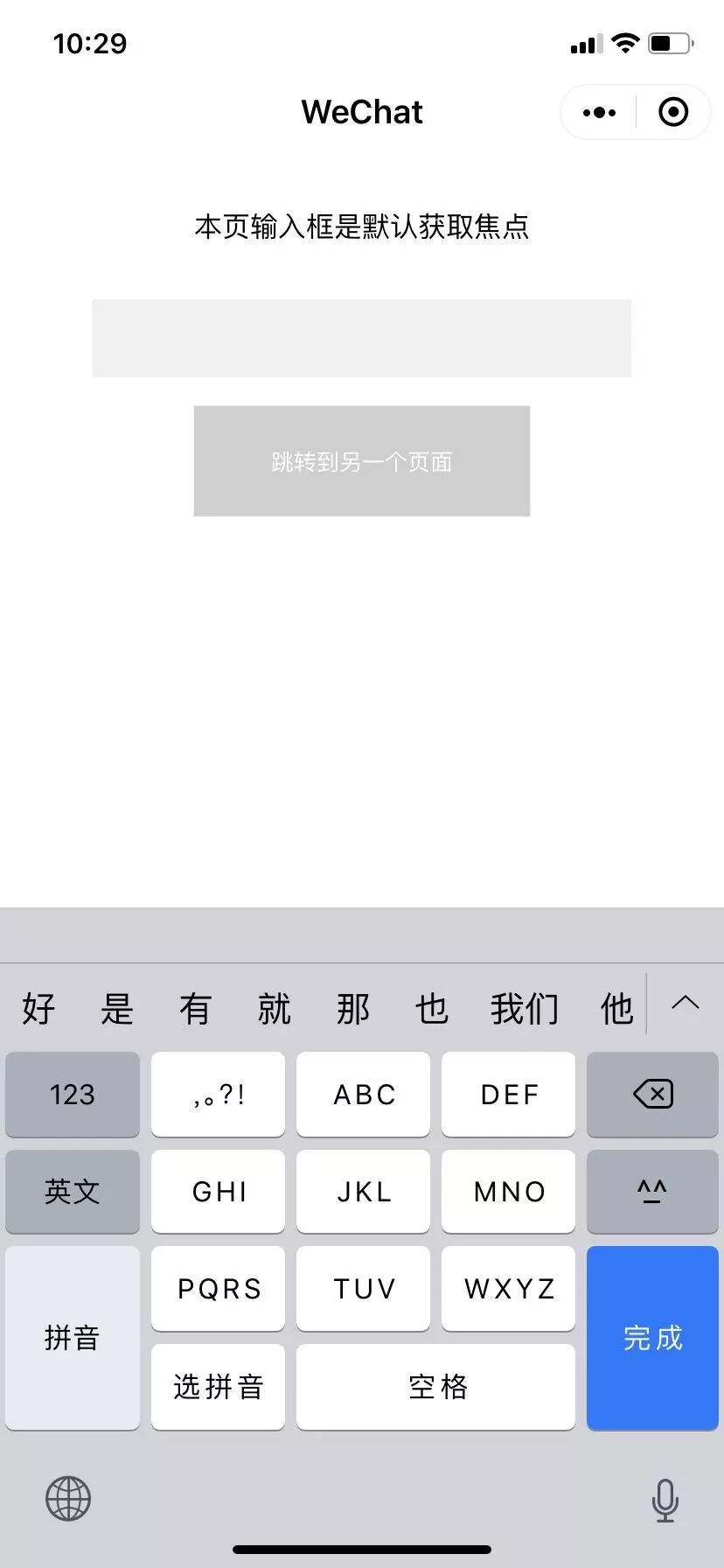 - 当前 Bug 的表现(可附上截图) Demo 里提供两个页面,第一个页面A是在 onshow 中自动获取输入框焦点,然后通过按钮点击跳转到下一个页面B,在B页面点击输入框获取焦点,聚焦状态点击导航返回到A页面,键盘唤起,但是无法输入内容到输入框,且无法关闭原生键盘,甚至关掉小程序,键盘还存在,影响使用微信