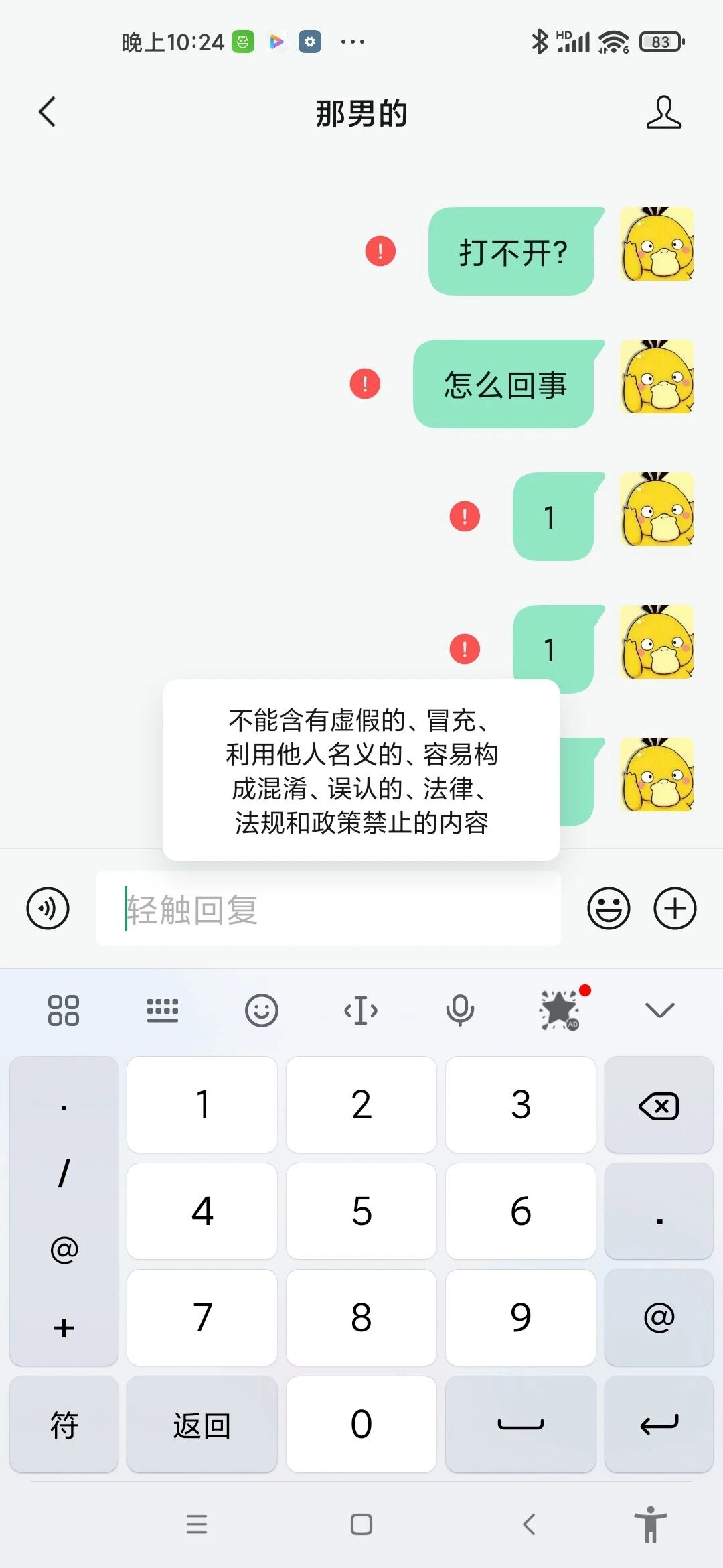 我的公众号今天下午开始突然什么消息都发送不出去,包括回复粉丝的消息发不出去,点击菜单栏也没有任何反应,关注后自动回复的消息也发不出去,发消息的时候显示不能含有虚假的、冒充、利用他人名义的、容易构成混淆、误认的、法律、法规和政策禁止的内容,但问题是我连个1都发不出去,而且后台也并没有任何的违规提示,请问这是什么情况啊