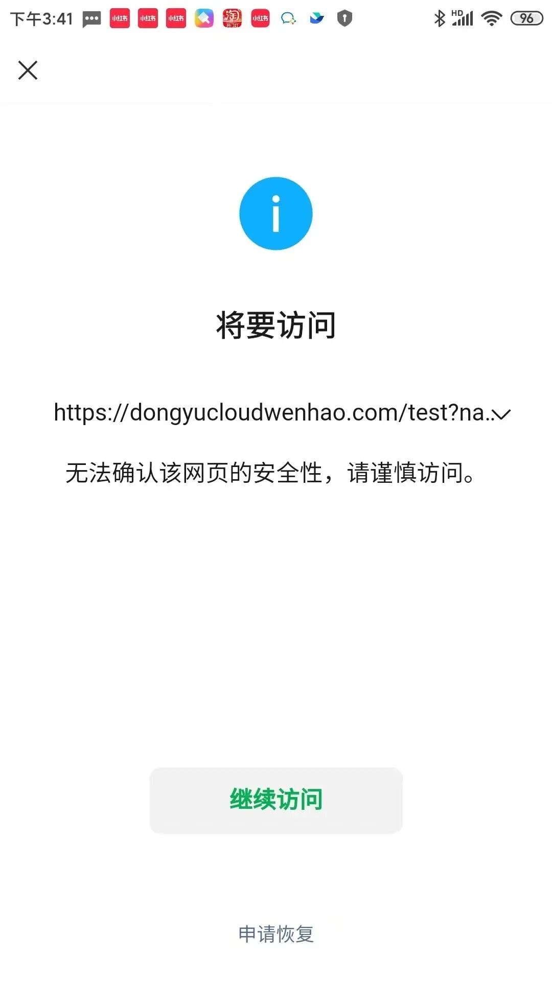 普通二维码跳转规则地址(https://dongyucloudwenhao.com/test?),域名已备案通过,浏览器访问正常,但是扫码打开被拦截。点击申请恢复后只有申请过的微信账号可以访问,其它手机仍然被拦截