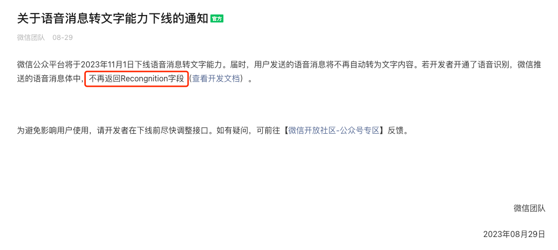 收到的Recognition字段为空,前一段时间都OK 今天开始 所有语音识别都失败,两个公众号都是同样的问题