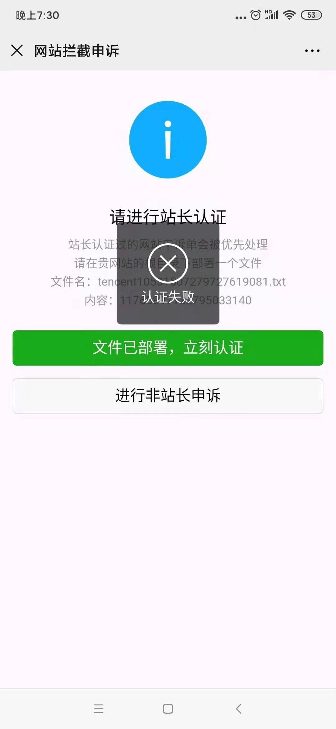 我在微信上进行站长申诉一直通不过,我进行普通申诉又不通过,说一定要站长申诉才行,所以现在进入了一个死胡同,你们要我放的文件我们已经放上去了http://www.hongkongdaily.net/tencent10531507279727619081.txt