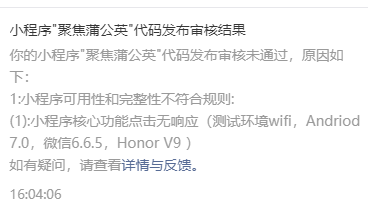 小程序“聚焦蒲公英”提交审核好几次了,审核都没有通过,提示核心内容点击无响应,希望有截图显示具体问题,我们自己测试没有问题,每个功能都能正常使用,请贵司核实一下,麻烦了。