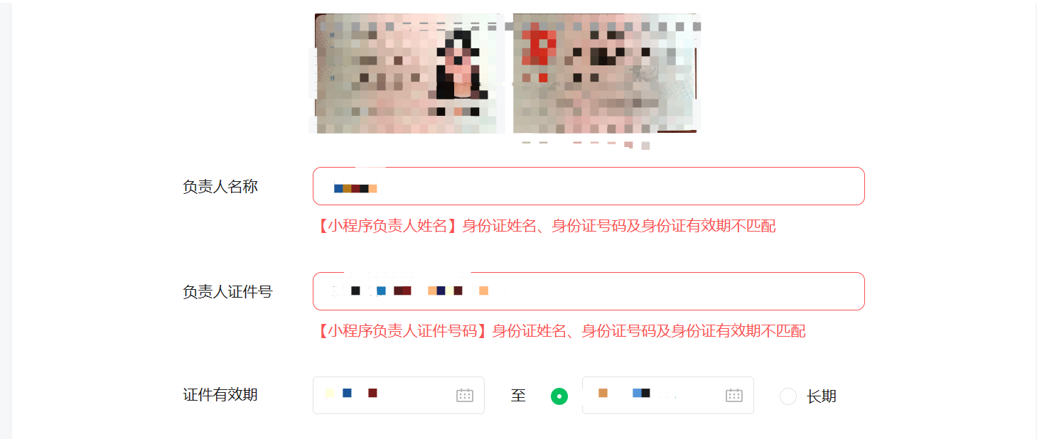 现在始终提示:[小程序负责人证件有效期截止时间]身份证姓名、身份证号码及身份证有效期不匹配