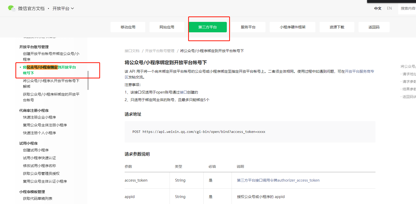在开放平台开发->第三方平台文档中 只有将公众号/小程序绑定到开放平台账号 的接口文档;