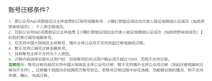 要是新旧主体的营业执照社会信用代码变更了,就只能用新的主体注册一个公众号,然后把旧的公众号迁移到新的公众号
