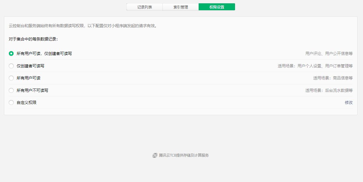 控制台新建集合后,默认权限为“仅创建者可读写”。我的数据是直接导入的,没有带openid,所以小程序查询时,获取不到,需要修改集合权限为 “所有用户可读,仅创建者可读写”,如下图。