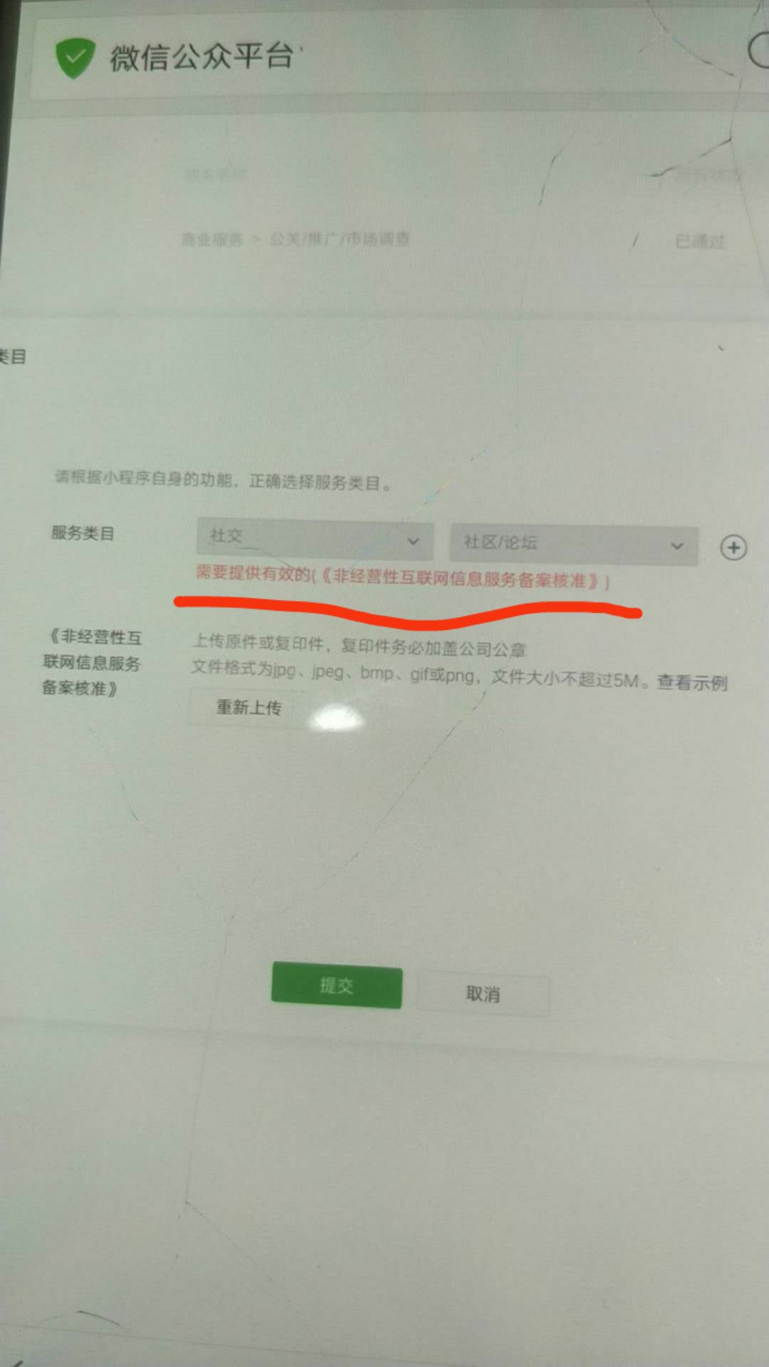 需要请问各位客服人员,麻烦替我解答下。我的小程序的服务类目中”社交 > 社区/论坛“需要上传这个(非经营性互联网信息服务备案核准),我这里通过查询示例图,腾讯要的是以下这个图