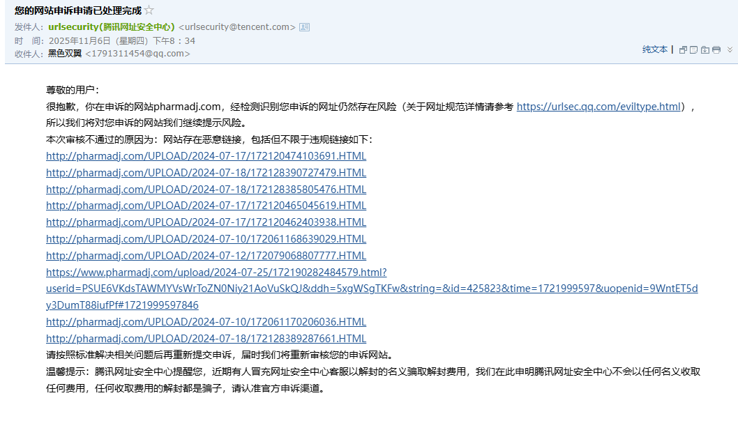 问题详诉:网站在微信上无法访问,提示该网页包含不安全内容。网站第一次被恶意上传了违规链接,后面进行处理了,也恢复了访问。但是那一次之后,多次被恶意举报成功,然后申诉后的反馈里面的违规链接是最开始的那个,已经处理过了的,是否是历史遗留问题。