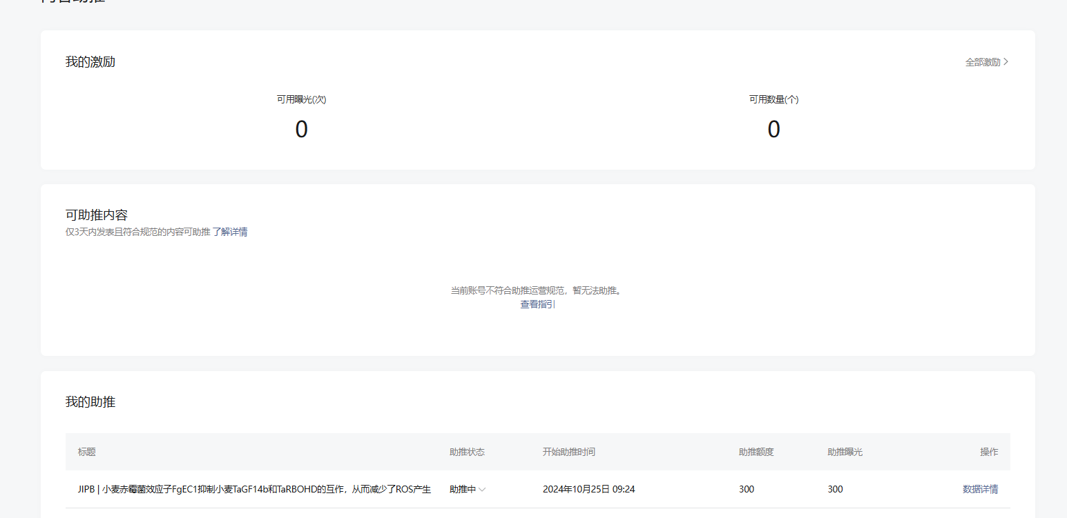 我的公众号是10.21注册的,这几天一直是原创发文,今天(10月25日)早上很意外的收到了内容助推功能,因此我把我昨天的一篇图文送上了助推,但是10月25日下午,助推结束之后,账号显示当前账号不符合助推运营规范,暂无法助推,请问是什么原因呢?我该如何解决?原始ID:gh_be9aad7a9a71