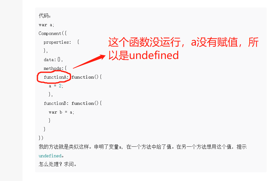 代码: var a; Component({ properties: { }, data:{}, methods:{ functionA: function(){ a = 2; }, functionB: function(){ var b = a; } } }) 我的方法就是类似这样。申明了变量a, 在一个方法中给了值。在另一个方法想用这个值,提示undefined。 怎么处理?求问。