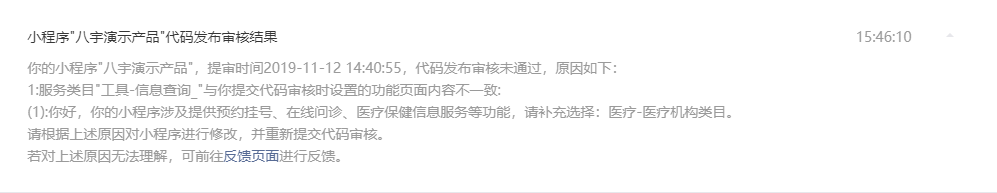 你好,贵方小程序涉及多家医疗机构医生提供在线问诊服务,需补充选择医疗-互联网医院类目