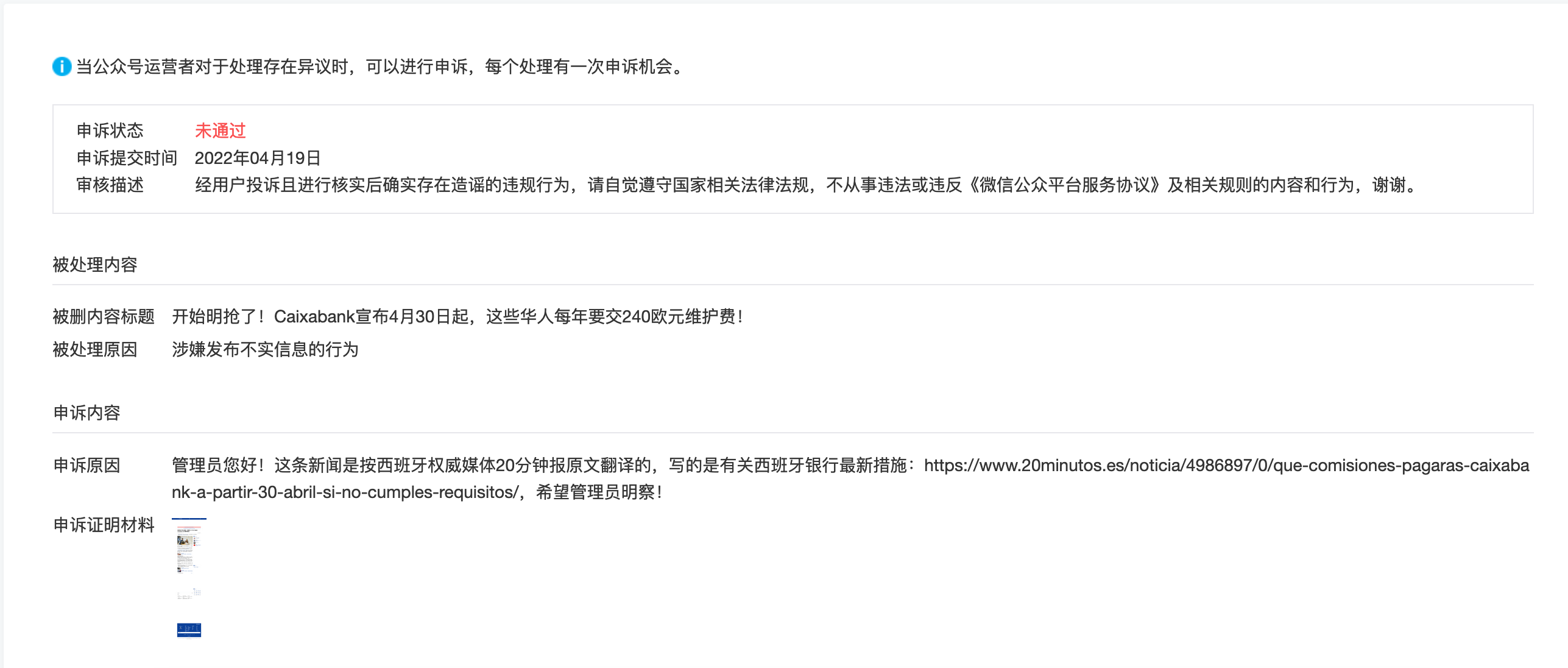 管理员和社区的朋友们大家好,我遇到了一个非常不解和委屈的问题,因为我们公众号的在前天发布的一篇文章因为涉嫌发布不是内容而违规被删除,理由是发布不时内容和造谣。在这里我们感到非常委屈和冤枉,因为我们发布的内容是西班牙(欧洲)国家的一家华人使用最多的银行CAIXABANK公布的最新措施,要求所有包括当地华人在内的用户满足一系列条件,不然每年要交240欧元的银行账户维护费。这篇内容我们也是翻译自当地西班牙权威媒体:https://www.20minutos.es/noticia/4986897/0/que-comisiones-pagaras-caixabank-a-partir-30-abril-si-no-cumples-requisitos/,此外其他当地媒体都有报道。这篇内容与中国国政府或任何机构的措施无任何关系,当地西班牙官方政府或者权威媒体也没有认定它是谣言,不知道审查员是以什么标准认定它是谣言和不实内容,我们已经申诉过了,但说我们是存在造谣: