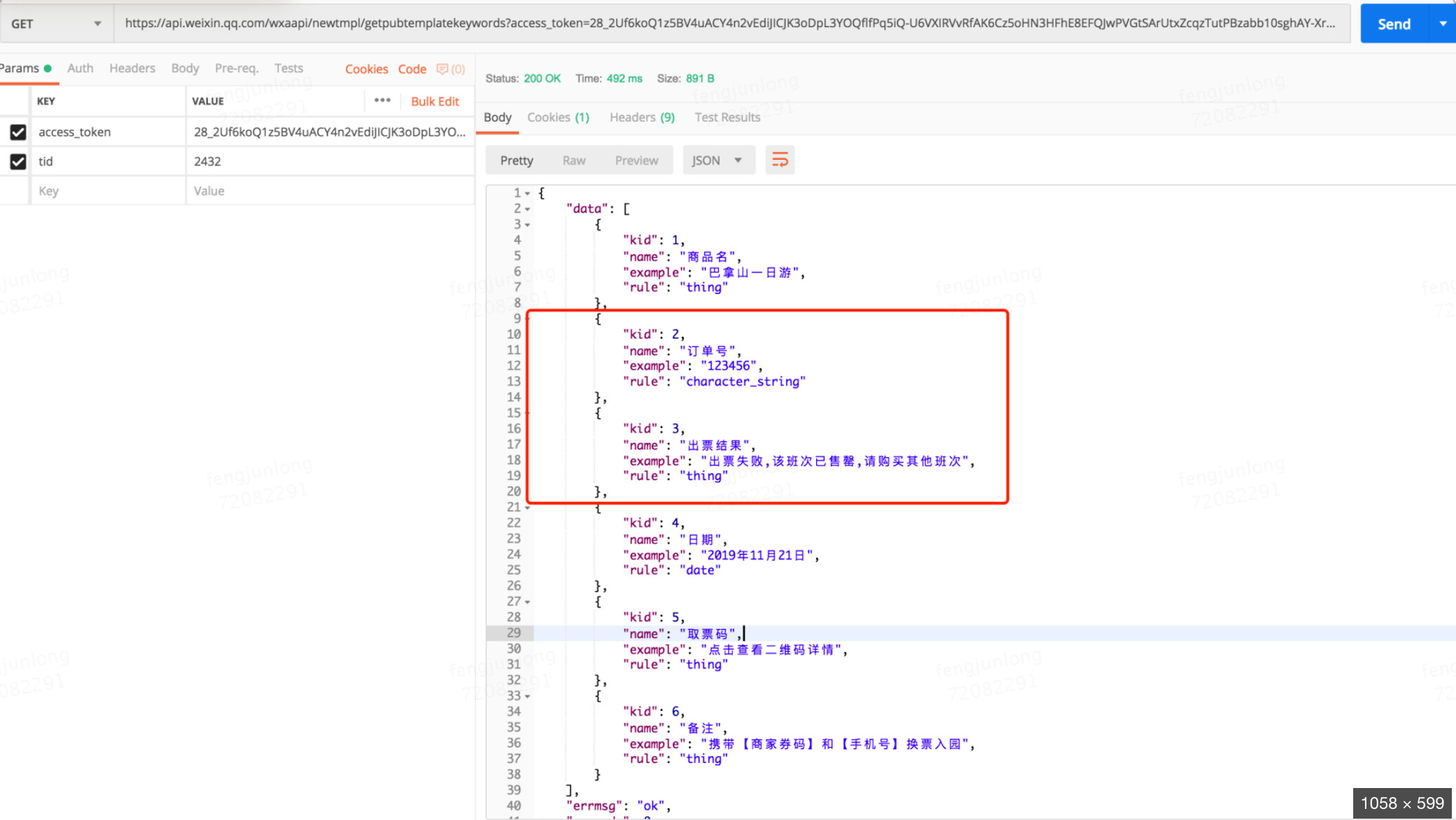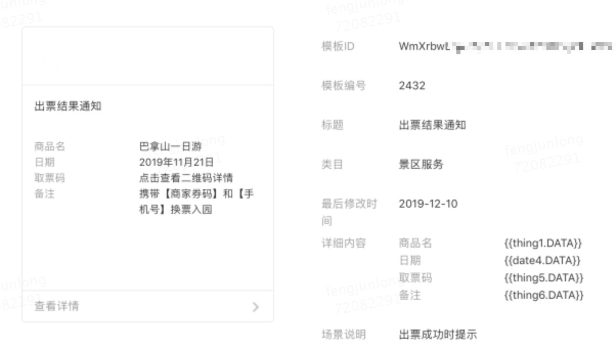 问题:通过subscribeMessage.getPubTemplateKeyWordsById的http接口调用方式获取模板编号为2432的模板下关键词列表,接口返回结果中比微信模板申请后台的详细内容关键词多了两个字段(订单号和出票结果)。