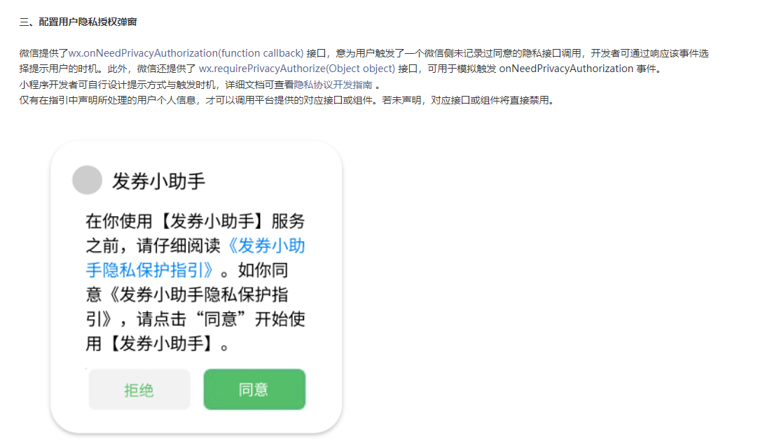 隐私协议开发指南参考:https://developers.weixin.qq.com/miniprogram/dev/framework/user-privacy/PrivacyAuthorize.html#_2-%E5%90%8C%E6%AD%A5%E5%BE%AE%E4%BF%A1%E5%BD%93%E5%89%8D%E7%94%A8%E6%88%B7%E5%B7%B2%E9%98%85%E8%AF%BB%E5%B9%B6%E5%90%8C%E6%84%8F%E5%B0%8F%E7%A8%8B%E5%BA%8F%E7%9A%84%E9%9A%90%E7%A7%81%E6%94%BF%E7%AD%96%E7%AD%89%E6%94%B6%E9%9B%86%E4%BD%BF%E7%94%A8%E8%A7%84%E5%88%99