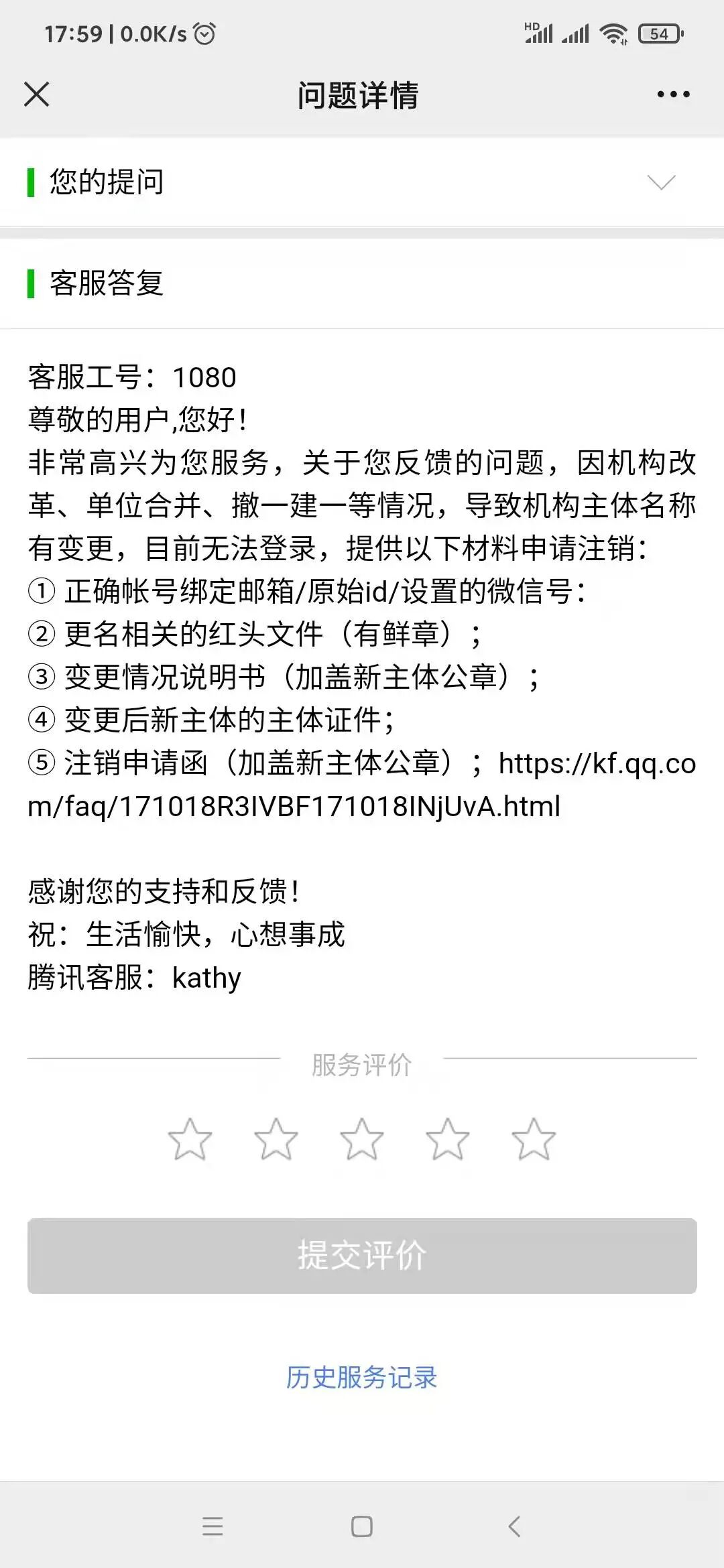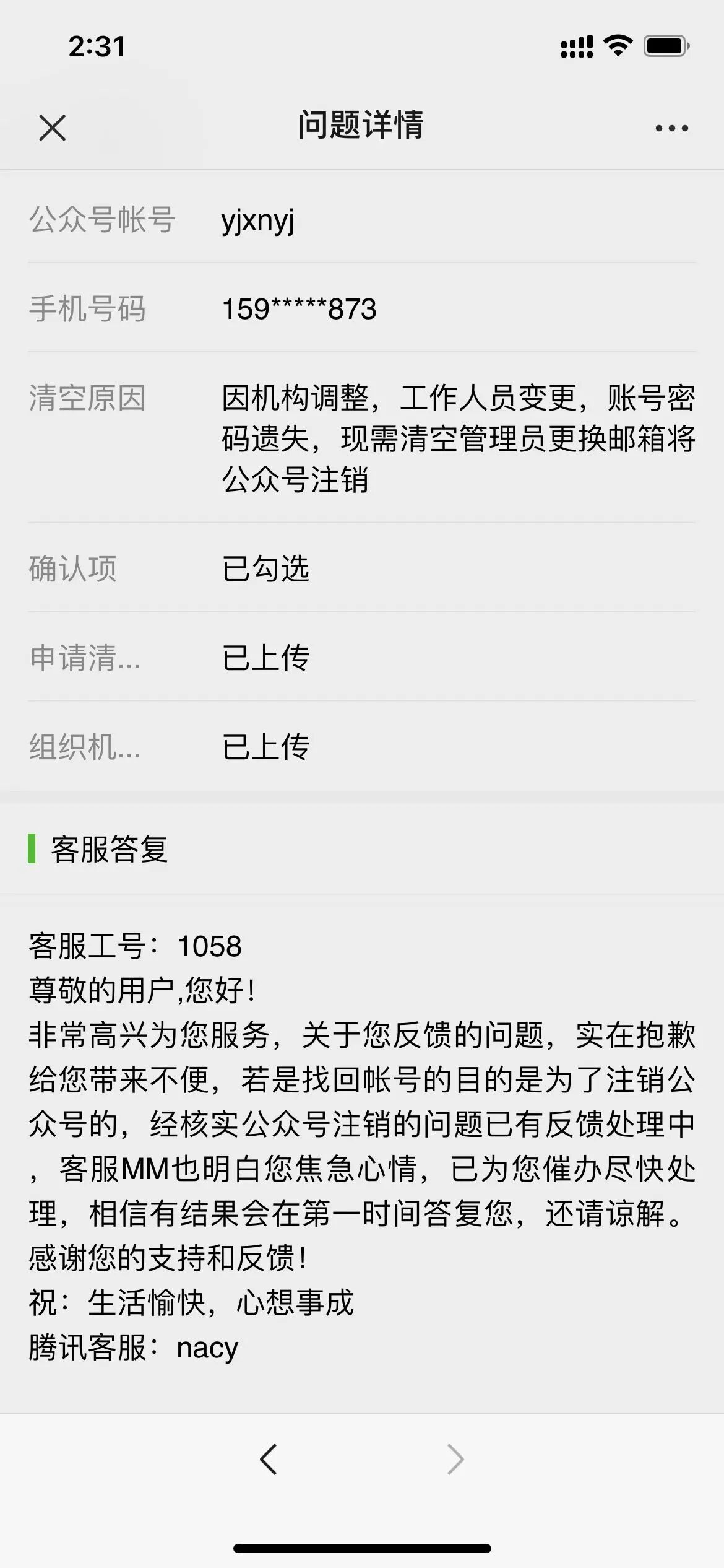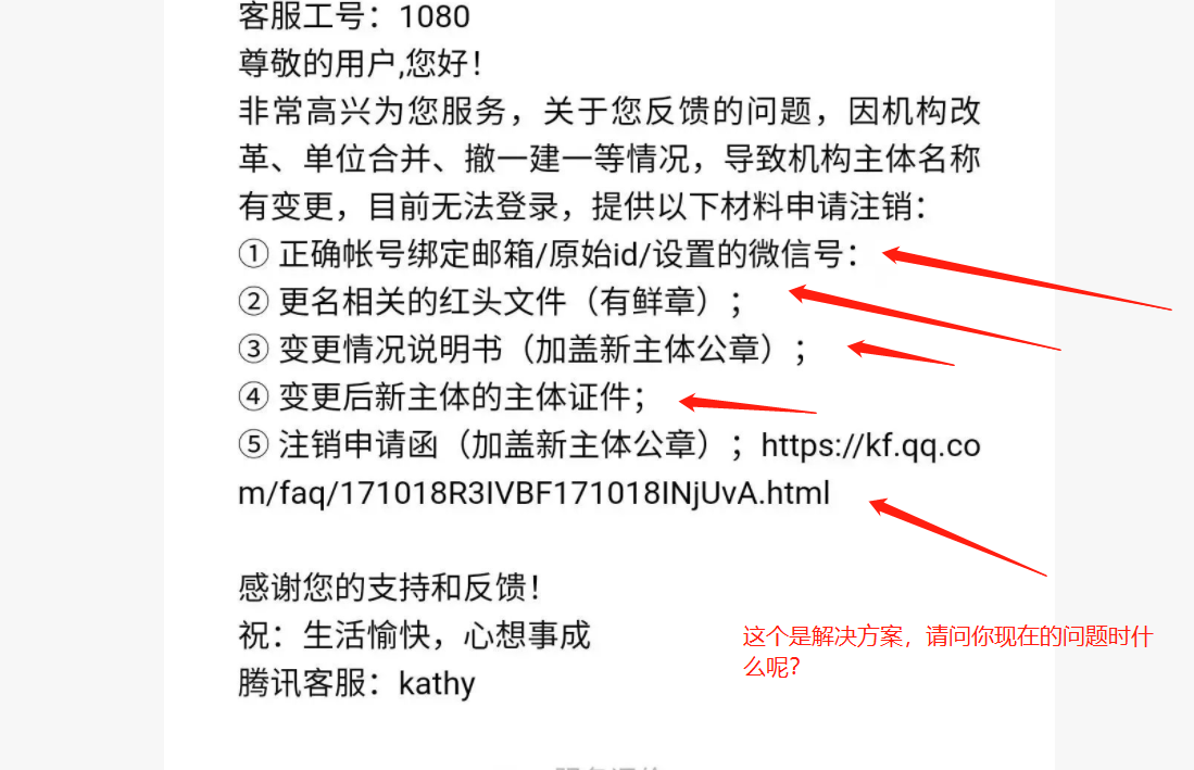 我县有6个政务新媒体僵尸账号因常年未使用、经办人员变更、机构改革等原因,账号密码均已遗失。按省、市统一要求需进行注销,但按要求提交相关资料后,客服要么不回复,要么回复继续提交资料。几个月来,不管是通过注销管理员更换邮箱的方式还是直接进行注销的方式都未成功,请工作人员明确告知:我们提交的资料缺什么,到底有什么问题,怎么才能尽快成功注销?如无法注销,请提供公对公发函投诉渠道,我县政府办将联合县网信办发函投诉。