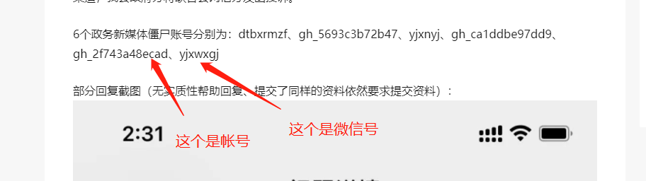6个政务新媒体僵尸账号分别为:dtbxrmzf、gh_5693c3b72b47、yjxnyj、gh_ca1ddbe97dd9、gh_2f743a48ecad、yjxwxgj