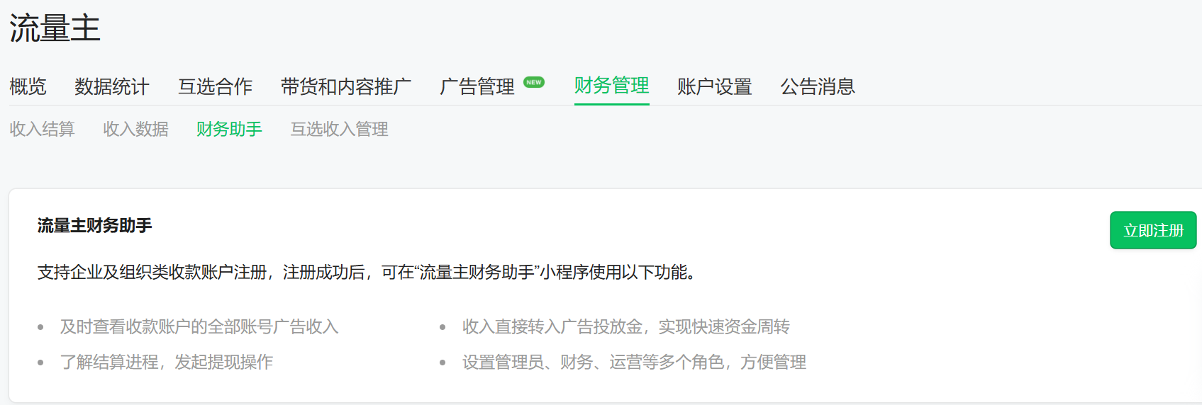 从流量主-财务管理-财务助手进去后,点击立即注册