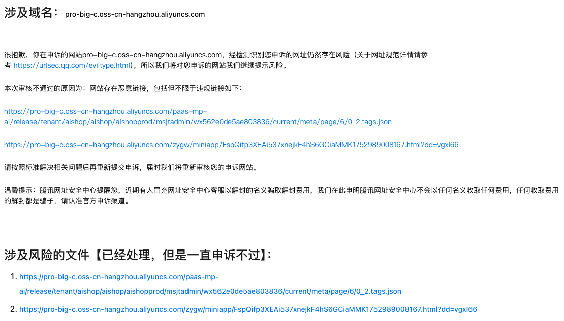 - 我司客户基于微信平台,合规开展我司业务,以上账号及部署域名均按照腾讯安全规范进行过腾讯年审认证及备案通过,且目前我司已协同阿里云封禁非我方的违规链接。麻烦尝试清除DNS缓存后,重新核对整改结果并解禁,谢谢!