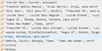 现在遇到一个关于字体名称提示的问题。在 font-family: 位置的提示信息内,只有英文字体名称,没有例如宋体、黑体一类的字体名称(自己输入也是可以的:font-family:'宋体';)。为什么提示列表里没有这类字体呢?