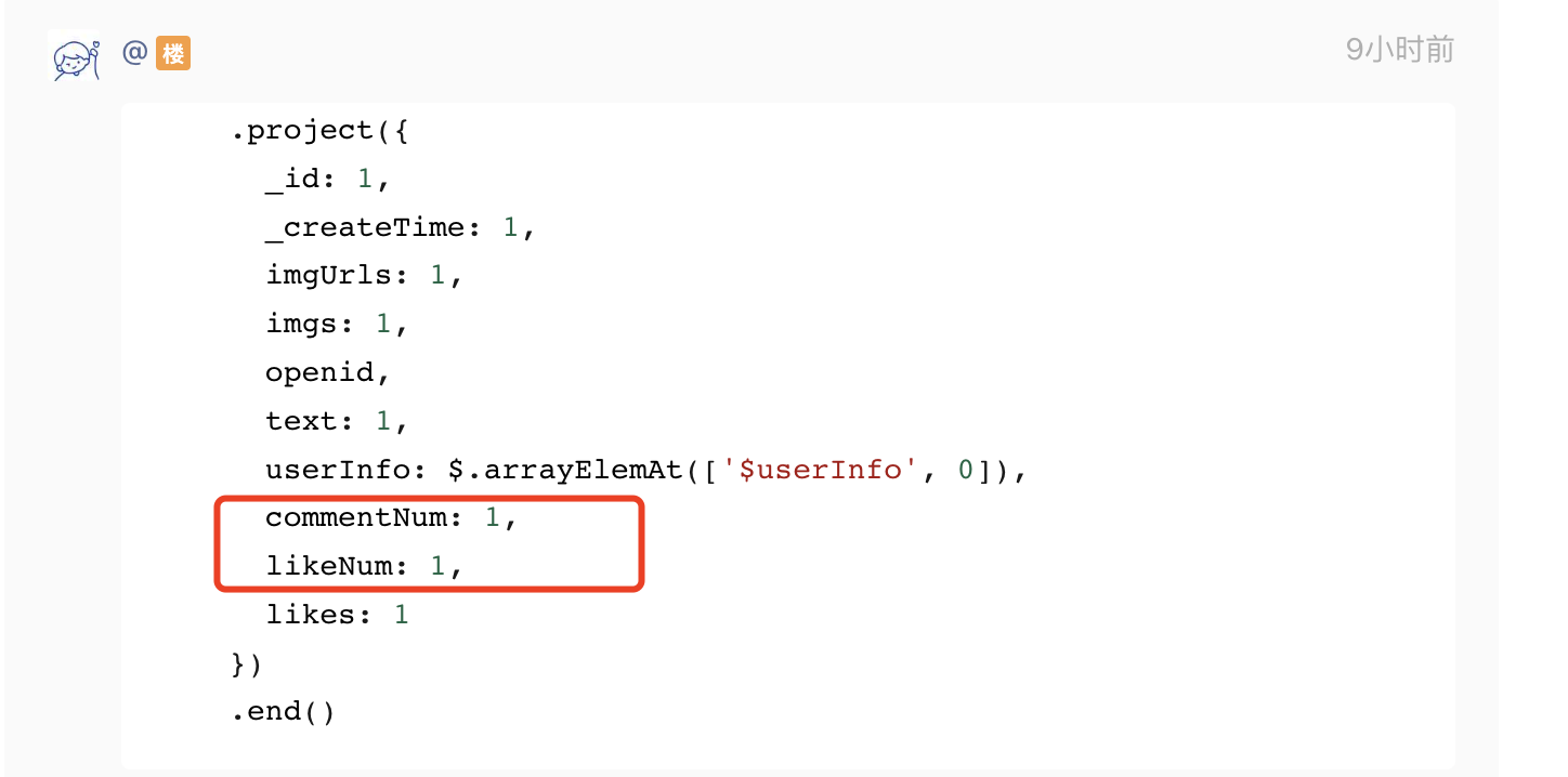 let result = await db.collection('social-dynamic').aggregate().sort({_createTime: -1}).match(searchObj).skip(page).limit(size).lookup({from: 'social-user',localField: 'openid', //<输入记录的要进行相等匹配的字段>,foreignField: 'openid', //<被连接集合的要进行相等匹配的字段>,as: 'userInfo', //<输出的数组字段名>}).lookup({from: 'social-like',localField: '_id', //<输入记录的要进行相等匹配的字段>,foreignField: 'did', //<被连接集合的要进行相等匹配的字段>,as: 'likes', //<输出的数组字段名>}).project({_id: 1,_createTime: 1,imgUrls: 1,imgs: 1,openid,text: 1,userInfo: $.arrayElemAt(['$userInfo', 0]),commentNum: 1,likeNum: 1,likes: 1}).end()https://developers.weixin.qq.com/miniprogram/dev/wxcloud/reference-sdk-api/database/command/aggregate/AggregateCommand.size.html