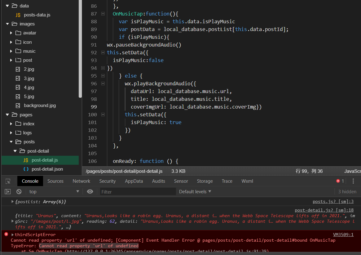 在写播放音乐的代码时点击播放按钮没有反应,这个是跟着老师做的,不知道哪里出了问题