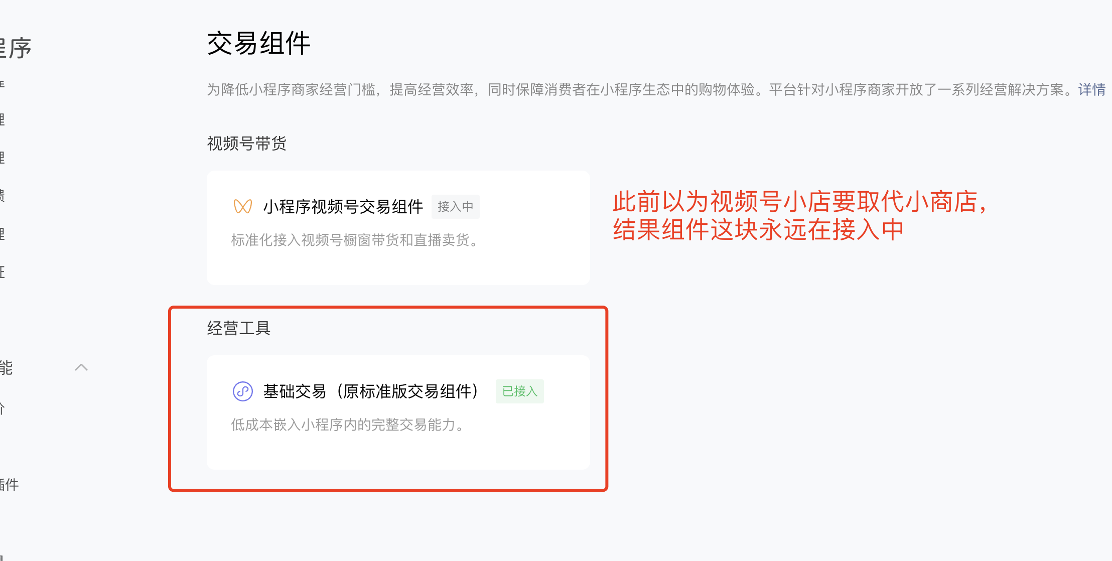 小程序交易组件真是命途多舛,微信小店,微信小商店,视频号小店,再到现在的微信小店,终于变成没人管的孩子了。之前小程序接入交易组件,就能在小程序中实现交易功能,后台是微信小商店管理。现在微信小商店发出通知,要求升级到微信小店。但交易组件这块并没有提及支持与否。害怕升级了,小程序内的商品交易就弄不来了。交易组价这边没人管,升级也不知道是否还需要小程序发版支持。不升级么,11月4号后就已经无法上新了。现在为了功能可靠性,只能先忍住不升级,又怕什么时候微信小商店的整个服务也彻底嘎了,交易组价也得不到升级支持。想问下,这个事情官方是彻底没人在管了吗?微信小商店还能活多久?小程序交易组件要怎么操作应对这部分升级?